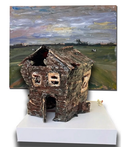 Accompanying these paintings are small-scale sculptures of Russian grandmas. The ceramic sculptures are created in a seated position, made to be set on edges- here installed on burned wood fragments, as if resting on the remains of some disaster. Like the figures in the paintings, they are sanguine and not overly moved by the incredible events happening or just happened.