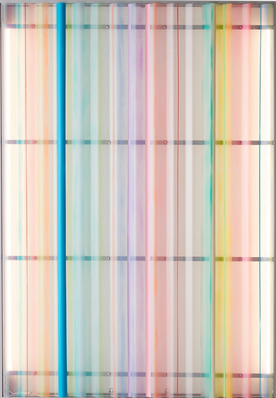 For each person who experiences Kang’s work, the emotions and memories suggested by the patterns of color and the lights behind them are uniquely varied and different. In fact, the striation of colors contribute to the emotional complexity and the visual layering of information. For example, a bright cyan being sandwiched between purplish blue and pinkish red suggests something abrupt or enclosed, which would differ drastically from a gradation of colored stripes that transitions smoothly from red to orange and to yellow. The sequencing of stripes also relates to how we remember the events, not always linearly.